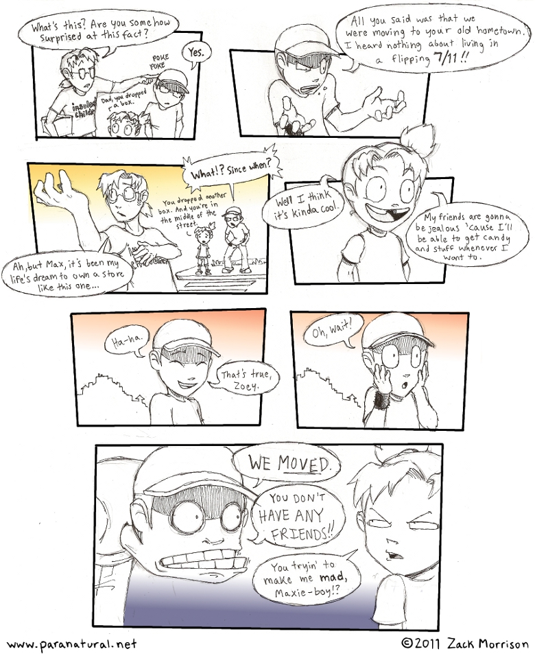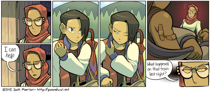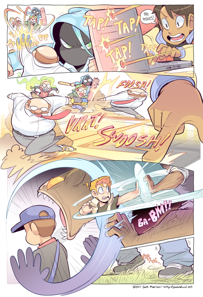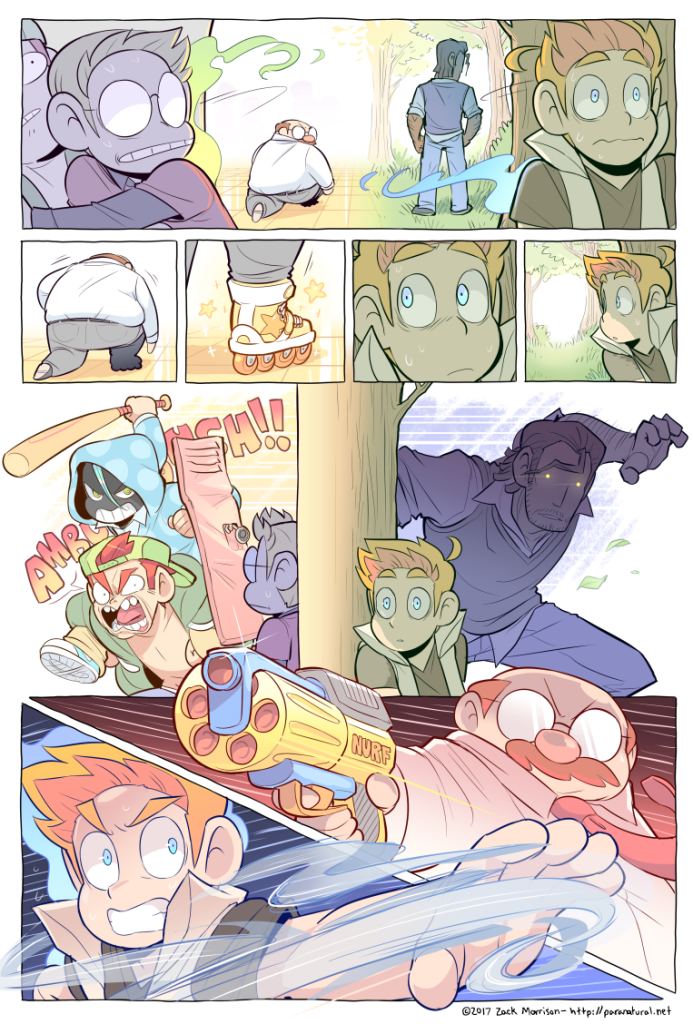 Above all else, Paranatural is a comedy and, considering its premise, you’d expect most of the punchlines to be about tropes and cliches. That’s certainly one ingredient, but the stew is much more varied and complex than it first appears. Zach Morrison, the writer and artist, is an expert at cramming each panel with as much comedy as can fit. This is evident even in its early pages, like Chapter 1 Page 2: