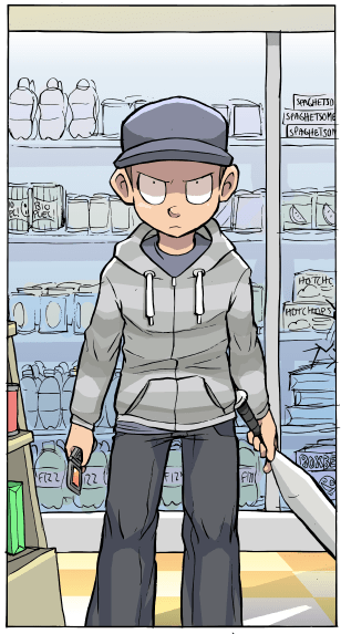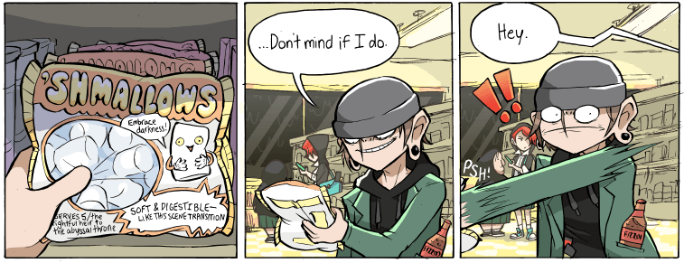 We start with the package of marshmallows, which has three different jokes on it, before we focus on the punk about to shoplift them. A text bubble coming from outside the frame appears, letting us know that someone new has entered the scene, which causes the punk to panic and try to put the package back.