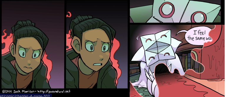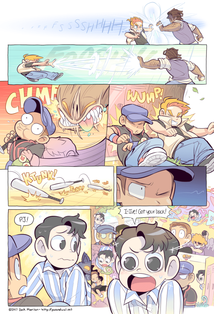 Though what really makes the art of Paranatural so stand out is seeing Morrison find their voice as an artist in real time. I mentioned before in my “Why Webcomics?” essay that this is something I love seeing in all webcomics, but Paranatural is unique in that Morrison was already an impressive talent so their evolution isn’t just them getting better at the fundamentals, but experimenting with different techniques. This can be seen in the myriad of differences from Chapter 4 going into Chapter 5. The line work on the characters has more edges and the colors tend to be a bit more subdued in 4 than the much rounder and brighter feel of the artwork in 5. Moving on to Chapter 6 brings a whole new shift as the darker color tone of 4 is combined with 5’s rounder characters to make something that has a very different feel. Morrison, as an artist, clearly loves going out of their comfort zone and trying new things to keep their story feeling consistently fresh with each new chapter. This talent has also led to them creating some of the most memorable and expressive characters in any medium.