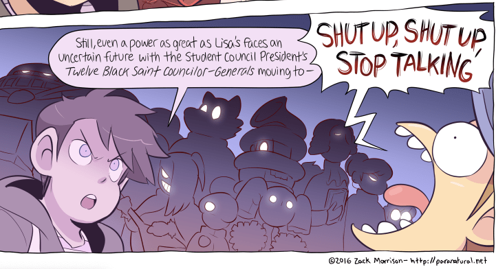 While a lot of information about the world of Paranatural is communicated through visuals, there are moments where info is dumped. However, these moments never feel clumsy or out of place, often feeling like natural conversations the characters are having. Part of this is because the characters talk like they normally do instead of like they’re reading off the wiki. Other characters will often interrupt with comments, questions, and sometimes just to make a jab at whoever’s speaking. The person talking isn’t always giving the full story either. They’ll often describe the broad strokes of things and leave the smaller details alone or they might be holding back information. The characters, even when delivering exposition, always stay in character allowing these scenes to hide the fact that they’re mostly happening for the benefit of the reader.