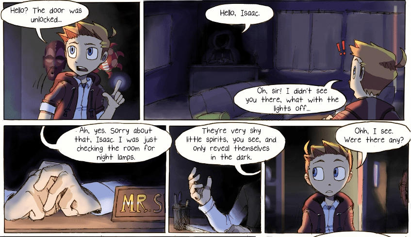 An example of all of this working together happens in Chapter 5 where Isabel talks to Max about something that happened before he joined the Activity Club. We can tell that whatever happened was recent enough to still hurt because she’s reluctant to go into specifics and lines like “I think Isaac tends to, like, play things out in his head too much?” The “like” and the question mark at the end makes it feel like something someone would say and not like Isabel’s reading from a script. They also aren’t having this conversation in a blank room, they’re walking to school and even having crazy encounters with spirits during the whole thing. There’s even some pretty great jokes snuck in there that add a bit of levity to what’s obviously a heavy subject. The fact that she’s so reluctant to go into specifics then makes the reader fill in some of the blanks on their own using information they’ve already learned about Isaac. This is a big reason why I love this webcomic, because when it has the chance to take the easy, tropey path, it finds a way to do something much more interesting.