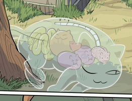 Though one of my personal favorite things about the spirits is just how many tiny details go into them. Like the palette’s on Muse, Doorman’s uniform looking like an actual door, and the individual scales on Forge’s armor. Hell, one of my favorite things about rereading the series for this essay was getting to see all the fun and creative background spirits. Stuff like this ghost cat, whose organs are other cats!
