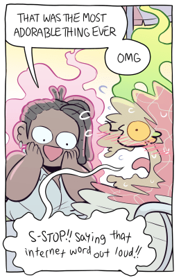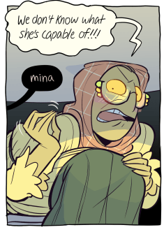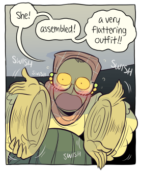 Even when the comic was just starting, Morrison showed that they have a real talent for sequential art. Their clean and expressive character designs had so much life in them, and when they started using color, the world really started to pop. However, what has always stood out about their work is just how dense with information their pages can be. That information could take the form of jokes, background details, or dialogue and often all of it happening at once. This runs the risk of being crowded, but Morrison’s panel layouts make everything digestible. They knows just how to guide your eyes from one panel to the next, whether using little visual clues to create a sense of motion from panel to panel, word balloons that stretch over multiple panels, or even having smaller panels that convey a character transitioning from one emotion to another. (Insert image) This firm grasp of the fundamentals also allows Morrison to push themselves in ways that I’ve never really seen before. Like these three pages from Chapter 5.